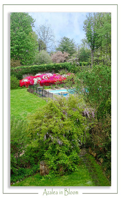The Azalea 's were planted to represented a Buddha Women lying down by the pool and is accented by the 100 year old Wisteria Arbor by the cottage