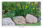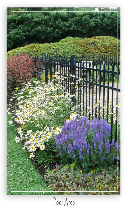 June brings and abundance of yellows everywhere. Buttercups bloom where purple iris fade. Yellow sedum & Campanula boarders the pool along with Lambs ear and Salvia.