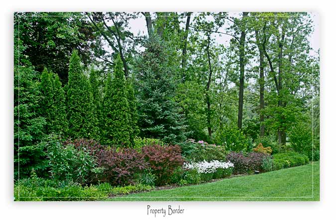 The property boarder was designed to create a natural barrier for complete privacy using 8-10'Arborvitae & Blue Spruce, then layering w/ Rose of Sharron, Barberry and abundance of Perennials which bloom from May thru Frost.
