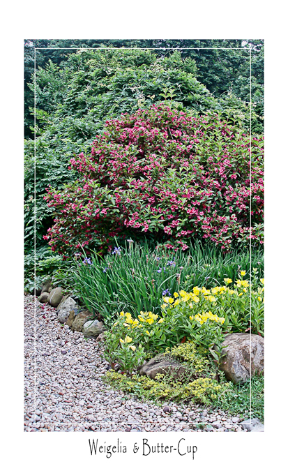 Mature Weigelia in full bloom enhance the perennials along with the large Snowball Viburnum Hedge at the end of the driveway.