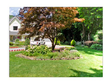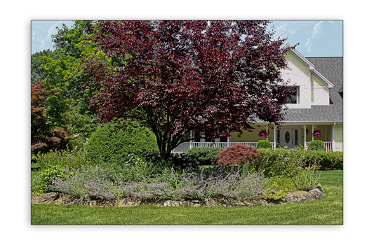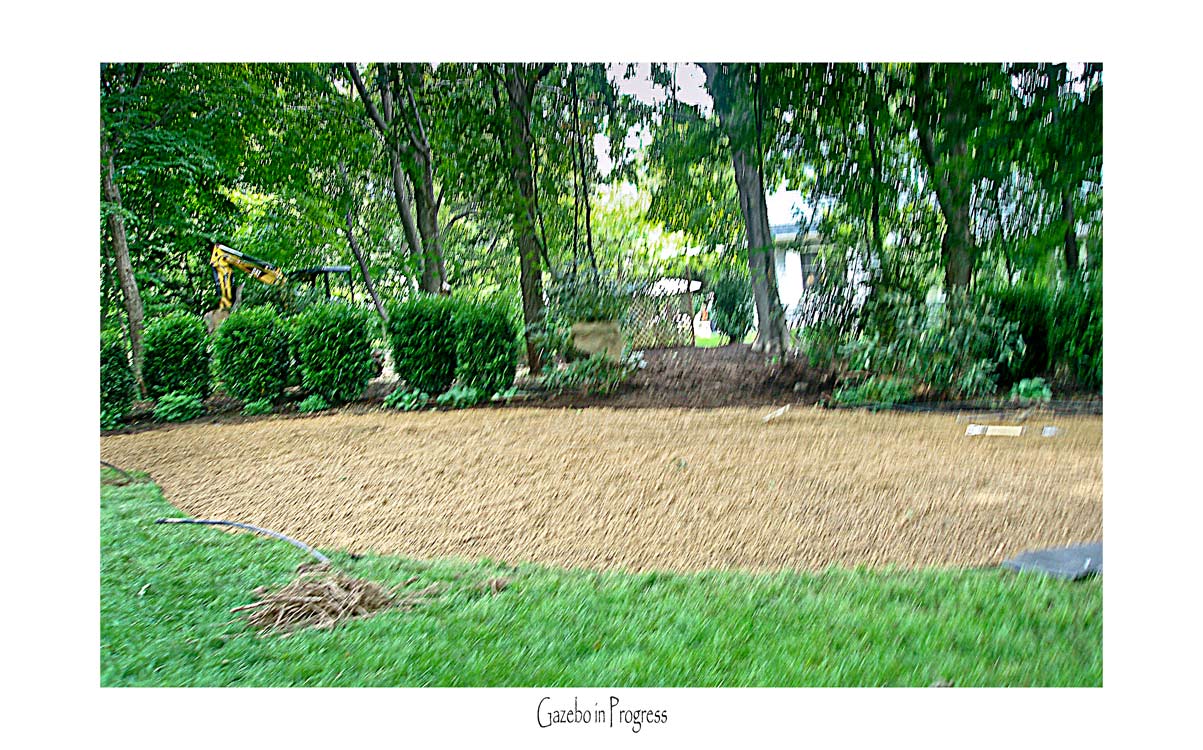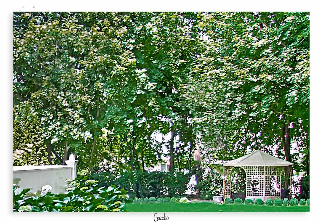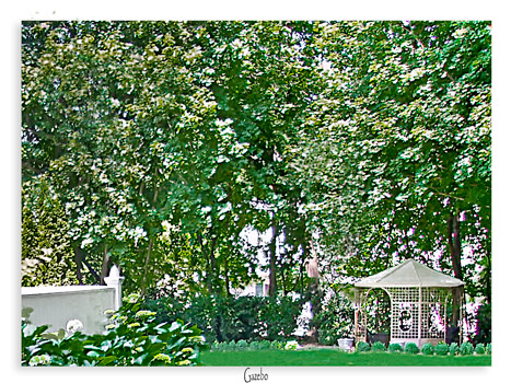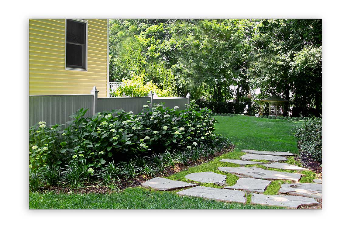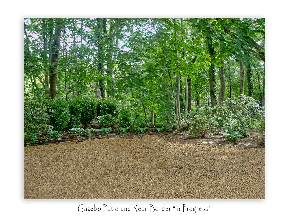 A tranquil Gazebo Garden was designed in the rear of the property under the large Oak Trees to give privacy as well as a place to relax. Assorted fragrant Virburnum along with Rhododendron, Skip Laurel and assorted Hosta and Astilbe to create privacy from the adjoining properties. This Pea Gravel Patio is bordered by Dwarf English Boxwoods. Sister Teresa Hydrangea and Blue Liorpe border the Random Sized Blue Stone Paver walkway.