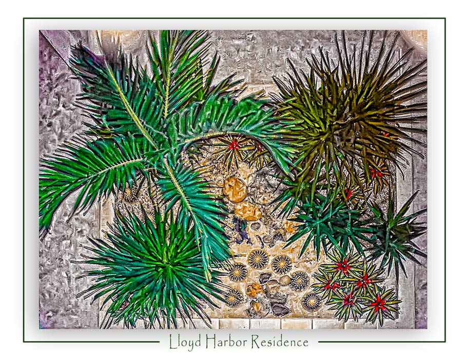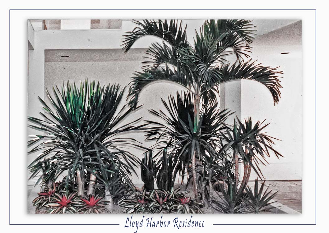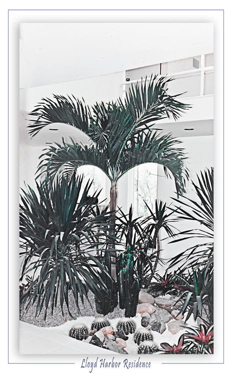 This Three-story Contemporary with walls of glass overlooks Cold Spring Harbor and the catwalks on each level look down upon this Award Winning Interiorscape, which is simple, but dramatic from the Entrance or above. Adonidia Palms reaching 14 feet and Specimen Arborea accented by Tri-Color-Neorgelia , Acrensis and Golden Barrel Cacti and Character Yucca Canes. Pea Gravel and Sand were used as ground cover.